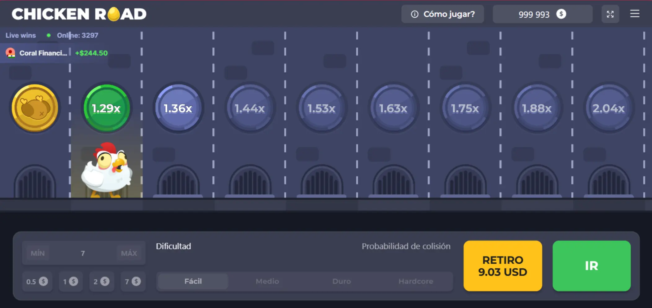 Ahora, ¿qué pasa con el multiplicador creciente en hardcore? Pues bien, nuestro juego inicia en 1.63x y en tan sólo 4 casillas, el multiplicador aumenta a 9.08x lo apostado, lo que hace de esta dificultad algo atractivo.En cuanto a las dificultades medio y duro, funcionan de la misma forma, con multiplicadores más bajos, pero que de igual forma dejan ganar dinero en Chicken Road.